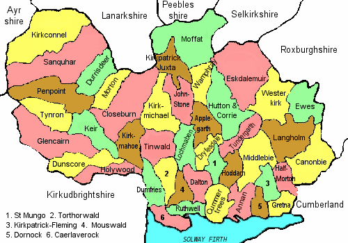 History of Dumfriesshire Archeological remains found in Dumfriesshire originated from the Bronze Age and include stone circles and sculptured stones. The Romans invaded this area many times and established camps and fortifications in Annandale. Roman altars, urns and coins have been found in many parts of this area. In the 13th and 14th Centuries, inhabitants of Dumfriesshire took a very active role in obtaining Scottish independence. Land on both sides of this border region suffered the consequences of war between England and Scotland. During the past 250 years, Dumfriesshire was an area of agricultural development, shipbuilding, engineering and sandstone quarrying. In the upland areas, forestry has more recently replaced the traditional sheep and hill cattle farming. Members of the Paterson family lived and were baptized, married, and buried, in various parts of Dumfriesshire -- Annan, Dumfries, Gretna, Lochmaben, and Tinwald -- during the 1700s and 1800s. For more on the history of